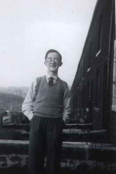 Here I am on the path at number 3 Gladstone Terrace, before all the porches etc spoiled the line of the wall. The Terrace has 22 houses, one of which has an extra room over a central thoroughfare. Compare with the colour photo here. Pat was actually responsible for much of the new "pointing" visible in the photo there. The window there was the second we had put in! |